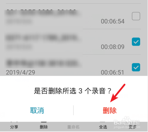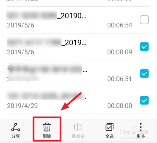 长按灌音文件后,我们勾选需要删除的灌音文件,点击下方的删除。