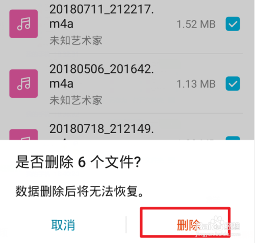 点击进入音频后,勾选需要删除的灌音文件,点击下方的删除。一般灌音文件后缀为m4a格局。