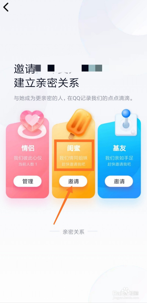 此处以闺蜜关系为例,点击箭头处的“邀请”按钮,即可邀请该老友成立闺蜜关系。
