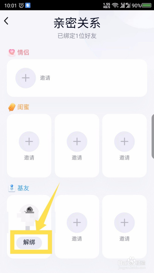 打开亲密关系后,选摘要解绑的老友,点击头像下面的解绑。如图