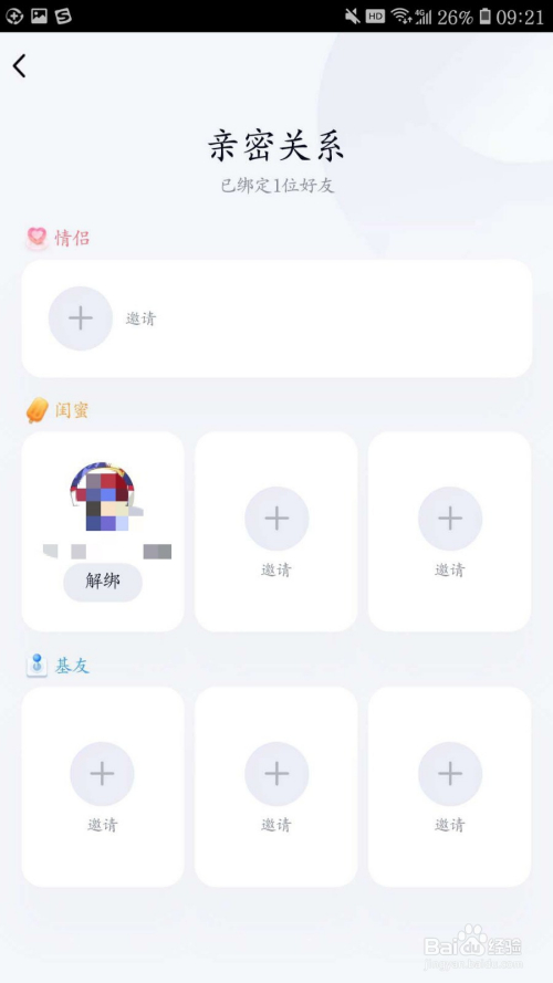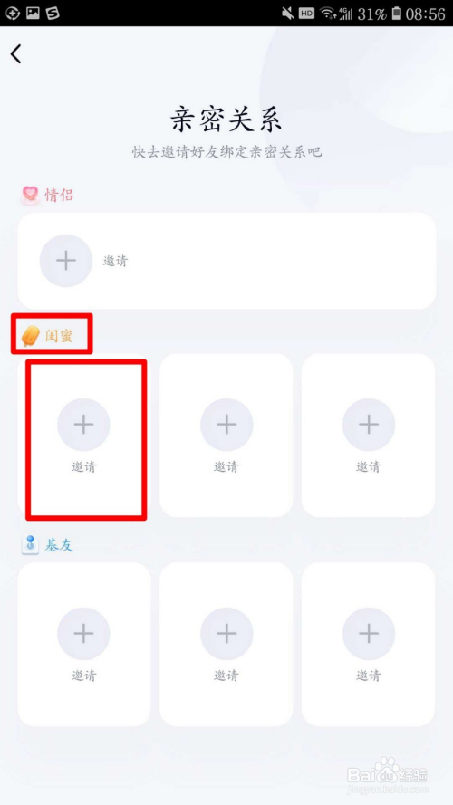 在“亲密关系”设置界面,小编做个例子,让一位老友当作为我的闺蜜。我们在闺蜜那一栏,邀请他。