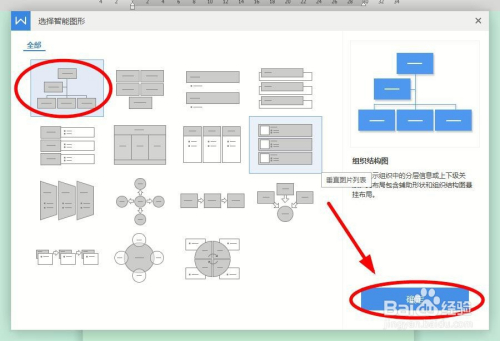 在弹出的“选择智能图形”对话框中我们选择第一种就是“组织布局图”,选中后单击“确定”