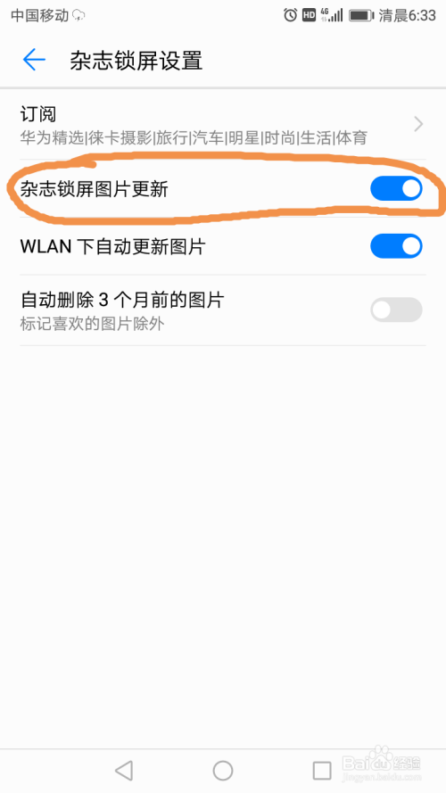 接着你可以看见你的杂质锁屏设置已封闭,这样手机就不会再主动更新下载杂志图片了。