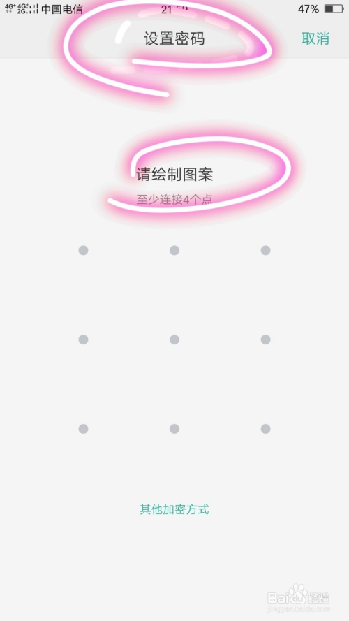 紧接着可以看到手势密码设置页面,按照本身的需要设置手势密码图案;