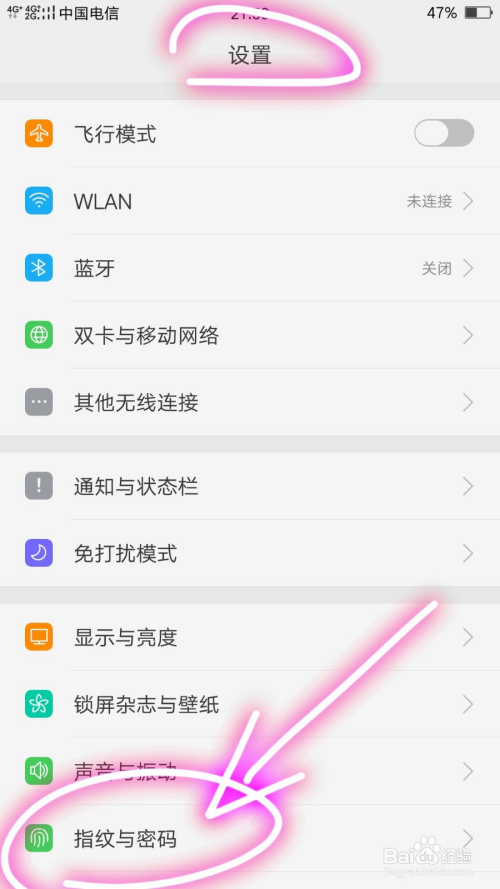 这时可以在打开的设置页面中看到诸多的设置选项陈列在页面中,找到指纹与密码设置项并点击;