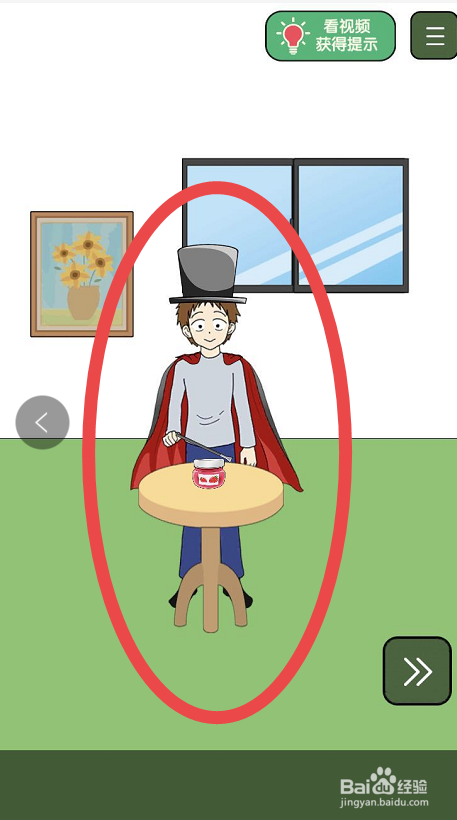 拿到帽子、小棍和作为大氅的红色窗帘之后回到左侧的房间,在左侧的房间内将这些都给游戏人物穿戴上,这样游戏人物就会化身另一个形象,然后利用手中的小木棍变魔术,然后将果酱罐子打开。
