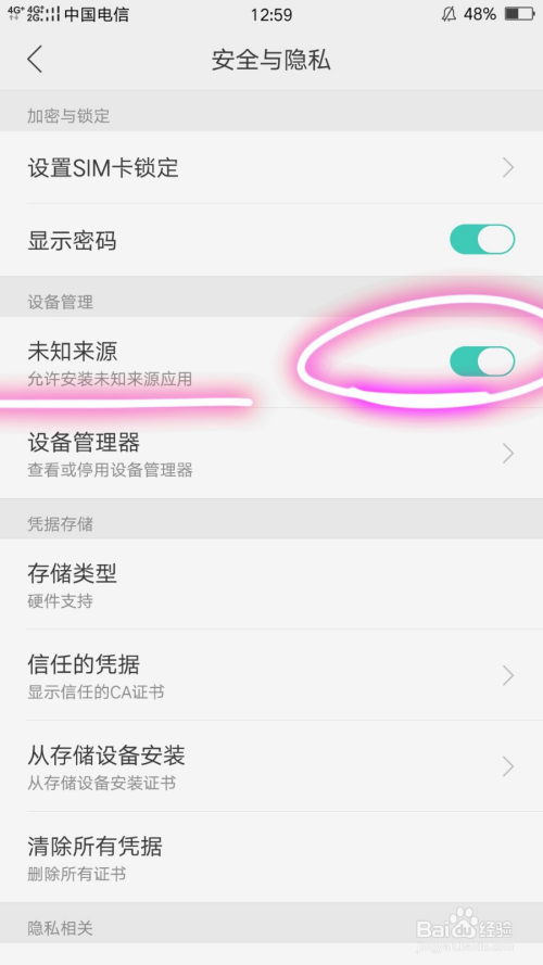 接着在打开的页面中可以看到未知来历选项;
