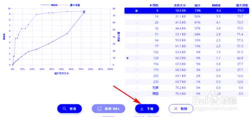 图片导入当作功之后,过一会儿就压缩好了。Recompressor一个很好的处所在于它列出了好几个压缩级别,操纵图表的形式很是直不雅的展示了每个级别颜色、大小、误差等参数。你可以自行选择合适的压缩级别,而且它还撑持png和jpg二种图片格局进行压缩和导出。