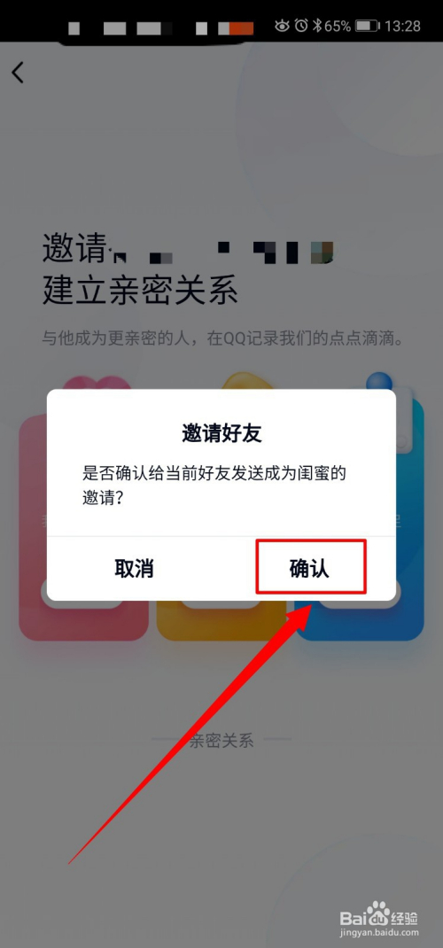 然后在弹出的邀请老友框中,点击确认即邀请对方成立亲密关系。