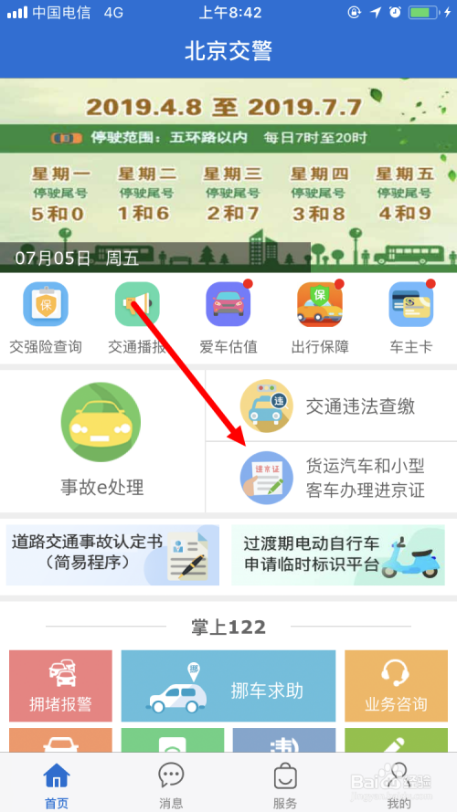 首先在手机上下载注册海说神聊京交警App,打开App后,在首页面点击货运车辆和小型客车打点进京证。