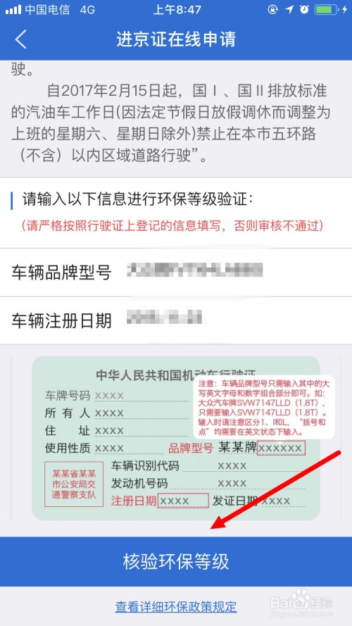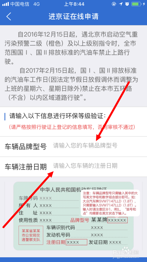 鄙人面这个页面里,输入 车辆品牌型号(只需要输入此中的大写字母与数字的组合部门)、车辆注册日期 。这两个信息在灵活车行驶证上面都可以看获得。