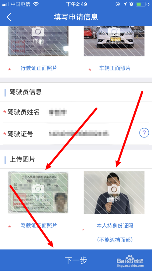 然后起头填写申请信息,这里需要上传四张照片,别离是:行驶证正面照片、车辆正面照片、驾驶证正面照片以及驾驶人本人手持身份证的照片。