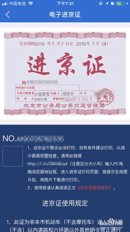 这就是小编打点的进京证。可以打印也可以不打印,若是可以打印的话,就将打印的进京证放置在车辆前挡风玻璃右下角即可。