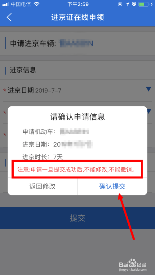 弹出对话框后,点击 确认提交 。手机上申请的电子 进京证 ,不克不及点窜,不克不及撤销。