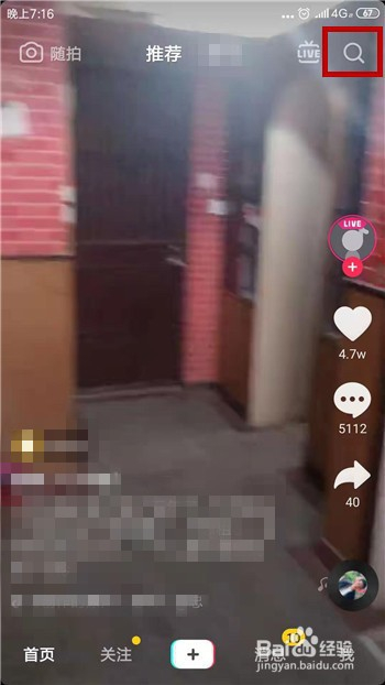 我们可以利用同条目道具来拍,打开抖音后点击右上角的【搜刮】选项。