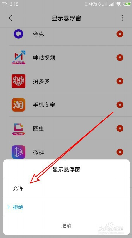 接下来在弹出的显示悬浮窗菜单中,我们点击许可的菜单项就可以了