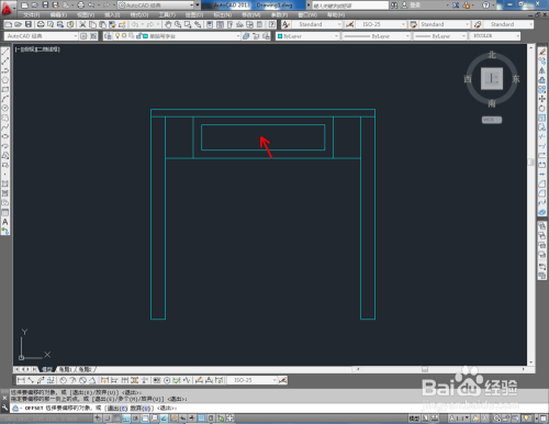 点击【直线东西】按图示绘制两条直线线段后,点击【矩形东西】绘制一个矩形图案。点击【偏移东西】按图示对矩形图案进行偏移。完当作后,将建造好的拉手图块导入文件并调整好拉手的位置,这样,我们的单抽写字台平面图便全数建造完当作。