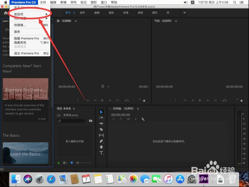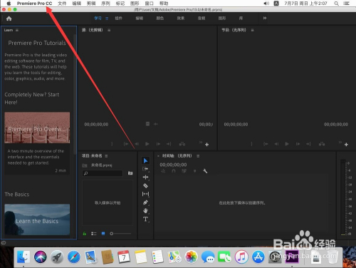 打开Pr后,点击屏幕左上角苹果标记右侧的“Premiere Pro CC”