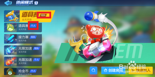 在休闲模式中,我们可以找到道具赛这个赛事,它分为了组队和小我两种游玩体例。