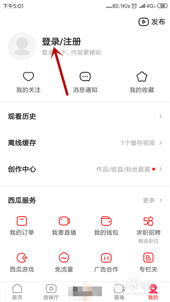 我们首先需要登录西瓜视频的账号,点击【注册/登录】。