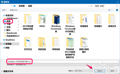 在另存为窗口中,我们先点击窗口左侧的【桌面】,在文件名(N)栏中输入:封闭主动维护功能.reg,再点击保留;