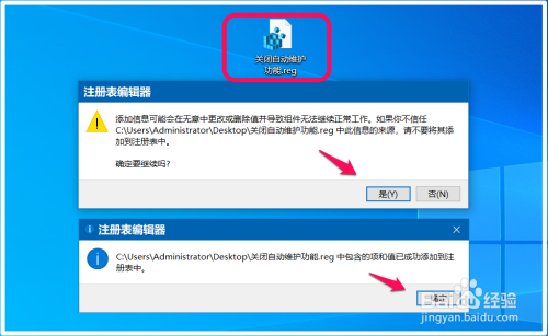 在系统桌面上找到并左键双击【封闭主动维护功能.reg】注册表文件图标,在先后弹出的注册表编纂器对话框中点击:是(Y)和确定;