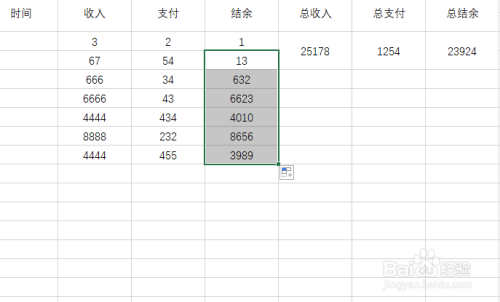 我们的按照现实环境知道,我们的节余应该等于当日出入差加上以前的节余,然后用鼠标点中D3格,下拉鼠标,就会让D列所有空白格均遵循D3的函数,进行计较。