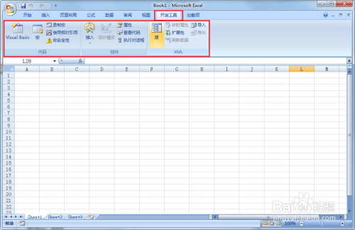 安装好Microsoft Excel 2007版后,在顶部工能区中一般只有“起头、插入、页面设置、公式、数据、核阅、视图”等选项卡。如下图: