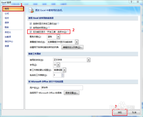 在“常用”选项卡里“在功能区显示开辟东西选项卡”前打钩,点击3处“确定”按纽。