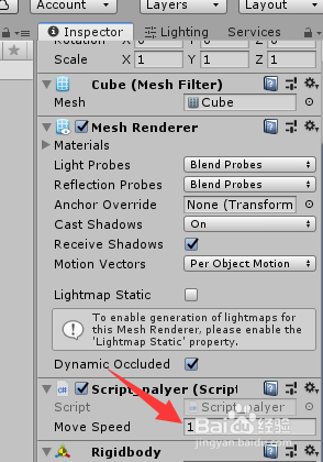 剧本写完今后,我们将剧本拖放到物体上,而且点窜MoveSpee参数为1