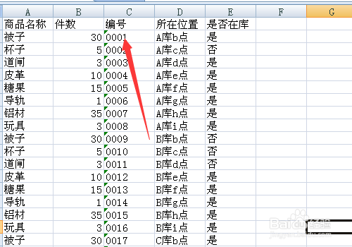 我要查找A库b点的被子在不在,怎么办呢?也就是要查找到编号是001的商品是不是在库.打开新的一页sheet2,用编号进行查找引用.并编纂好表头,"编号"和"是否在库".还要包管第一页引用的数据中编号在前,成果在后!!!!!
