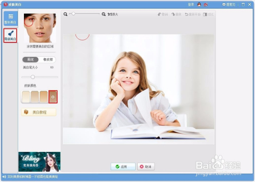 第四步:在“皮肤美白”对话框中,切换至“局部美白”标签页,皮肤颜色选择最黑的,美白笔调整至合适的大小。