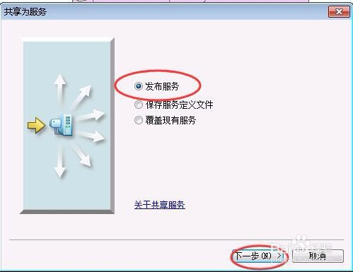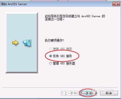 在弹出的添加ArcGIS Server对话框中,选择“发布GIS办事”,然后点击“下一步”,如下图所示: