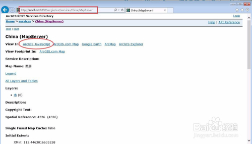 此时浏览器中打开输入地图办事的REST URL地址,点击ArcGIS JavaScript,如下图所示: