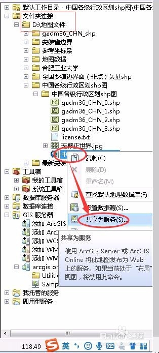 当我们编纂好一个地图后,找到ArcMap中的文件夹毗连目次下的某个mxd地图文档,右键选择“共享为办事”,如下图所示: