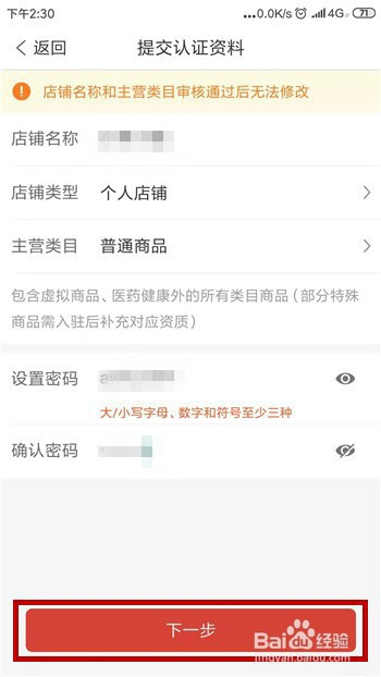 认证的第一步需要填写店肆名称、本家儿营类目以及设置账号密码,填好后点击【下一步】。