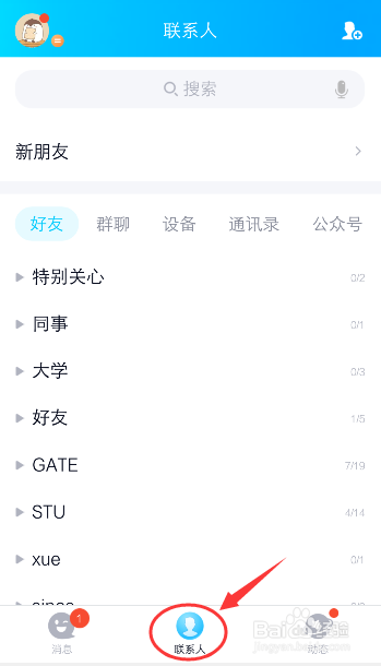 进入QQ聊天页面,点击东西栏的【联系人】。