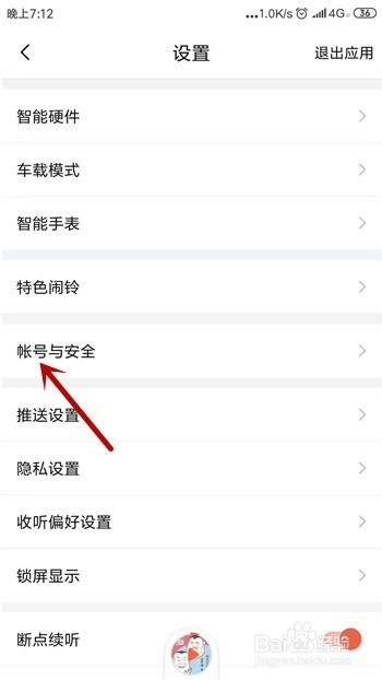 在喜马拉雅的设置里点击【账号与平安】,如图所示。