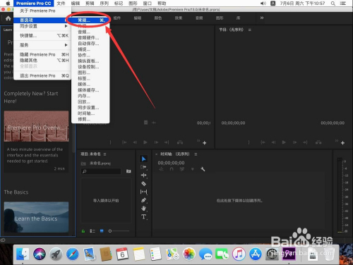 打开Premiere后,点击屏幕左上角苹果标记右侧的“Premiere Pro CC”