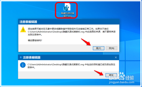 在系统桌面上找到并左键双击【启用沉浸式搜刮栏.reg】注册表文件图标,在先后弹出的注册表编纂器对话框中点击:是(Y)和确定;