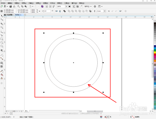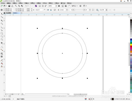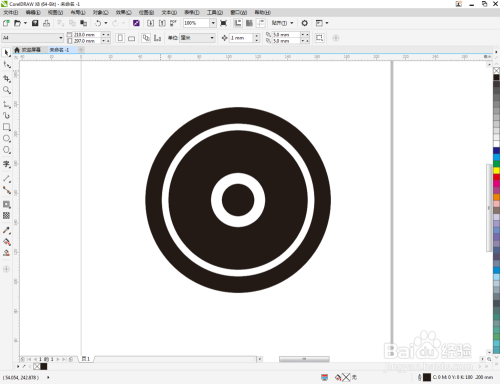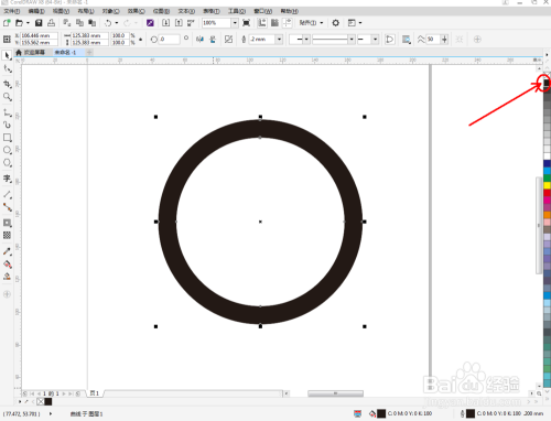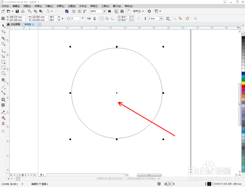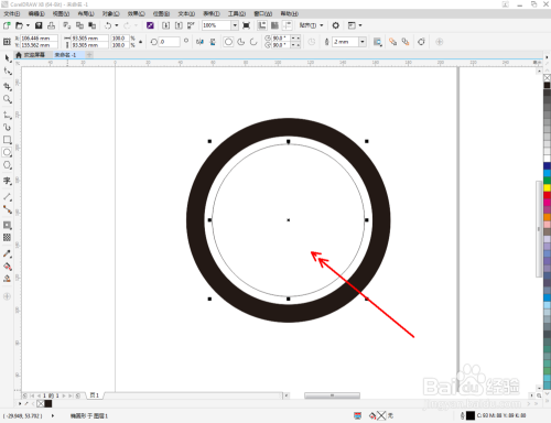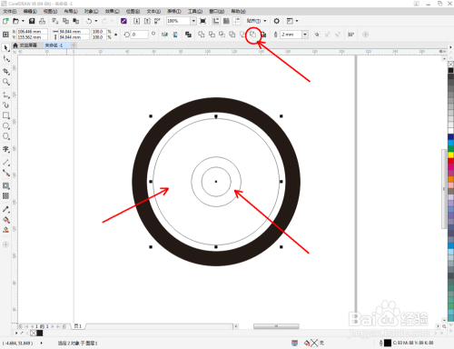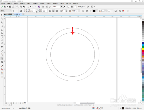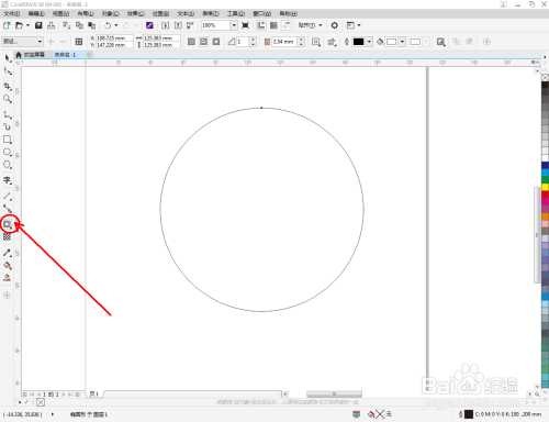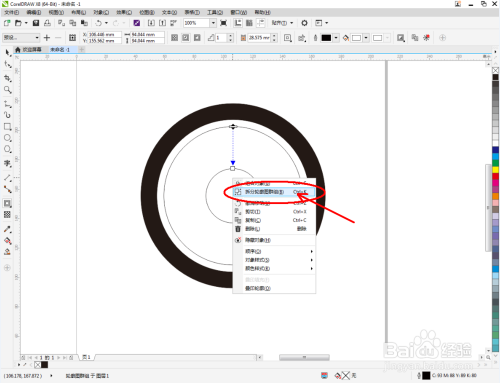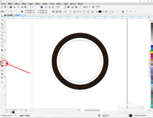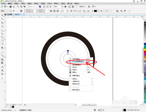 点击【卵形东西】在作图区域绘制一个圆形图案。点击【轮廓图】拉动圆形图案进行轮廓处置后,点击鼠标右键-【拆分轮廓图群组】将图案拆分(如图所示);