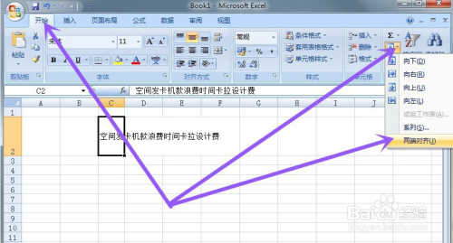 点击起头找到填充,鄙人拉菜单中找到两头对齐点击。