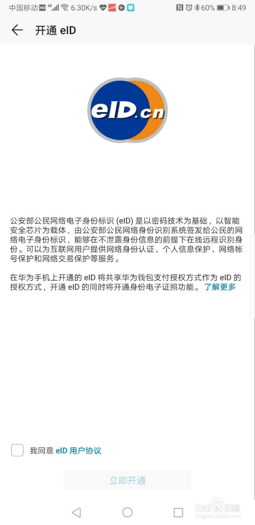 找到证件一栏,点击进去,注重:初次利用需要开通EID(收集电子身份标识)办事,我们可以看见上面介绍,收集身份证是由公安部开辟,同时会授权给各个平台利用的,所所以比力平安的。我们在左下角的框里打钩赞成,然后点击“当即开通”即可进入下一步