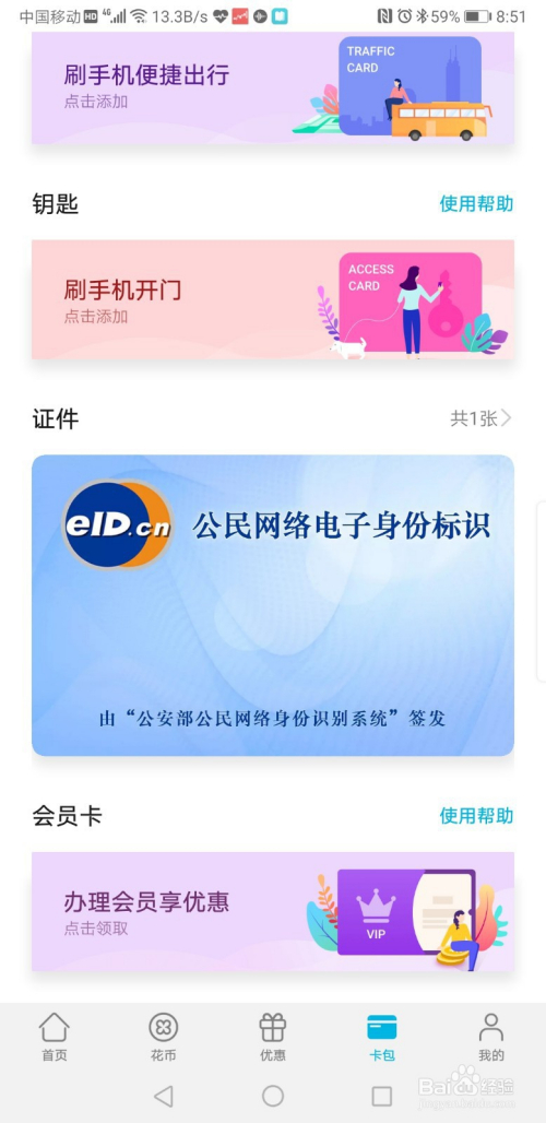 返回到【卡包】界面,我们就可以看到当作功添加的身份证了,点击进去可以看到我已经开通的EID和添加的身份证信息了。