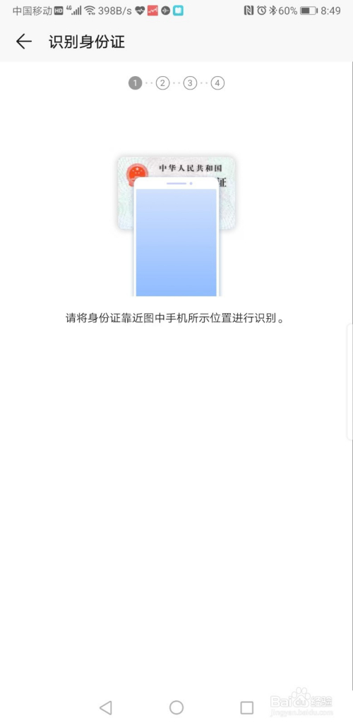 按照提醒将身份证接近手机图片提醒位置进行识别。识别当作功今后会主动进入下一步,这里要本家儿要的是身份证必然是二代以上的,具有芯片的才能识别,不然识别不出来。