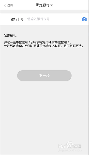 还没有竣事,系统会继续弹出窗口让你绑定银行卡,我们输入信用卡卡号后,点击下一步!