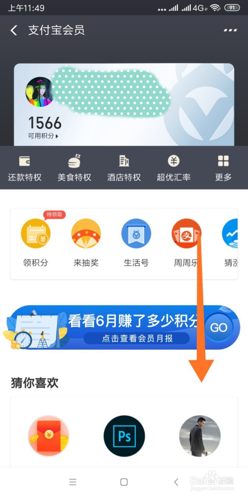 - 4进入“支付宝会员”页面后,将屏幕往下滑。