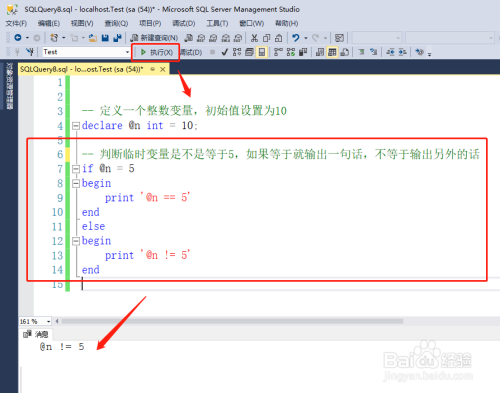 在上一步打开的sql语句输入窗口,界说一个整数类型的变量,设置初始值等于10