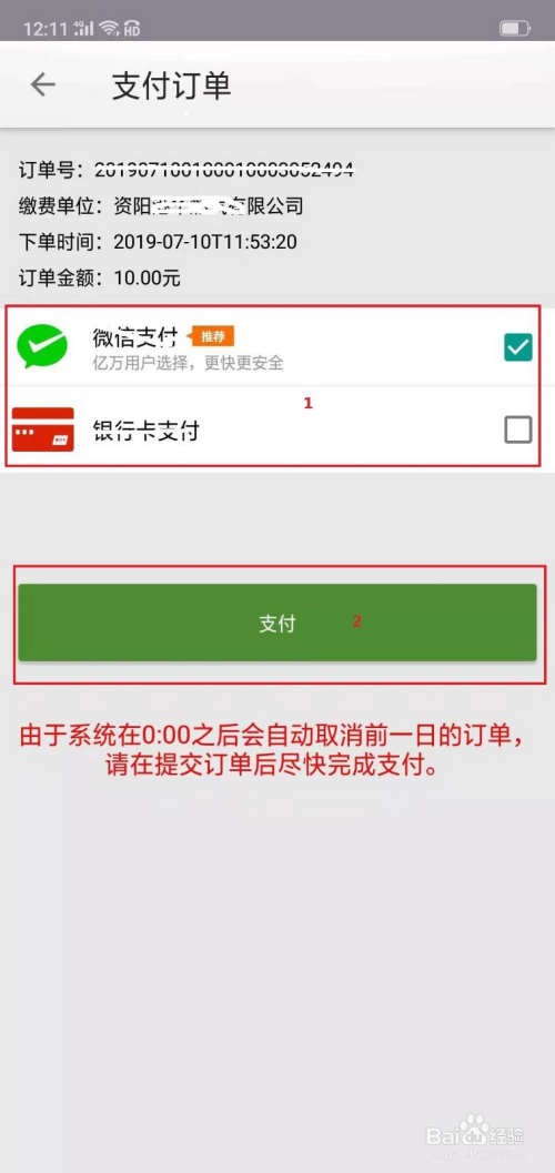 选择支付体例,本例选了“微信”,点“支付”