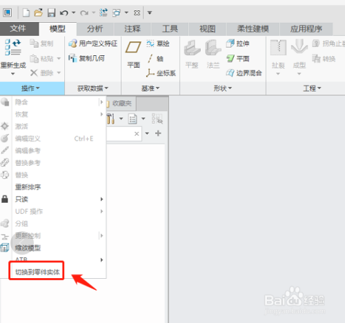 选择模子-睁开操作,选择下拉菜单最下方的切换到零件实体